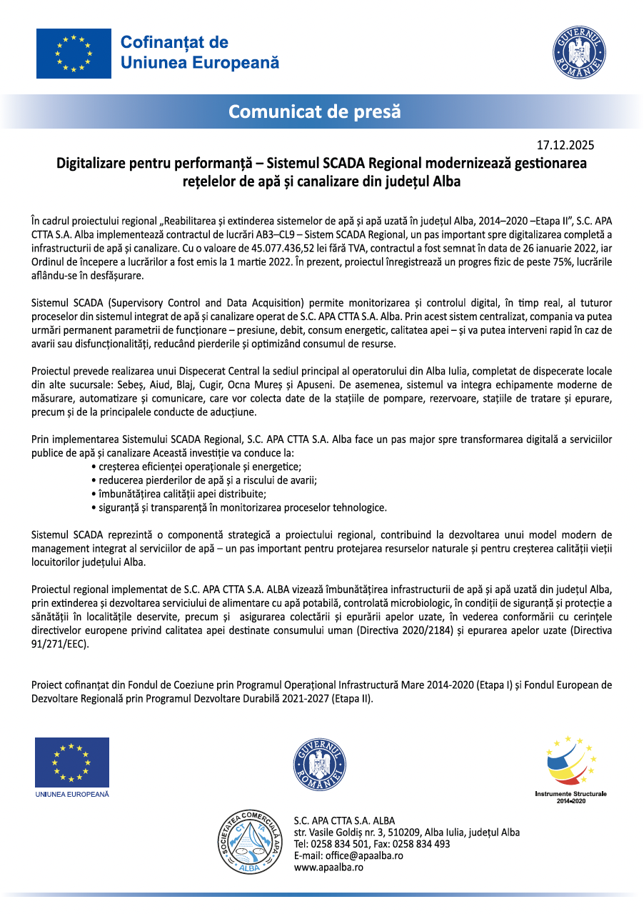 S.C APA CTTA S.A. Alba prezintă stadiul implementării Proiectului Regional