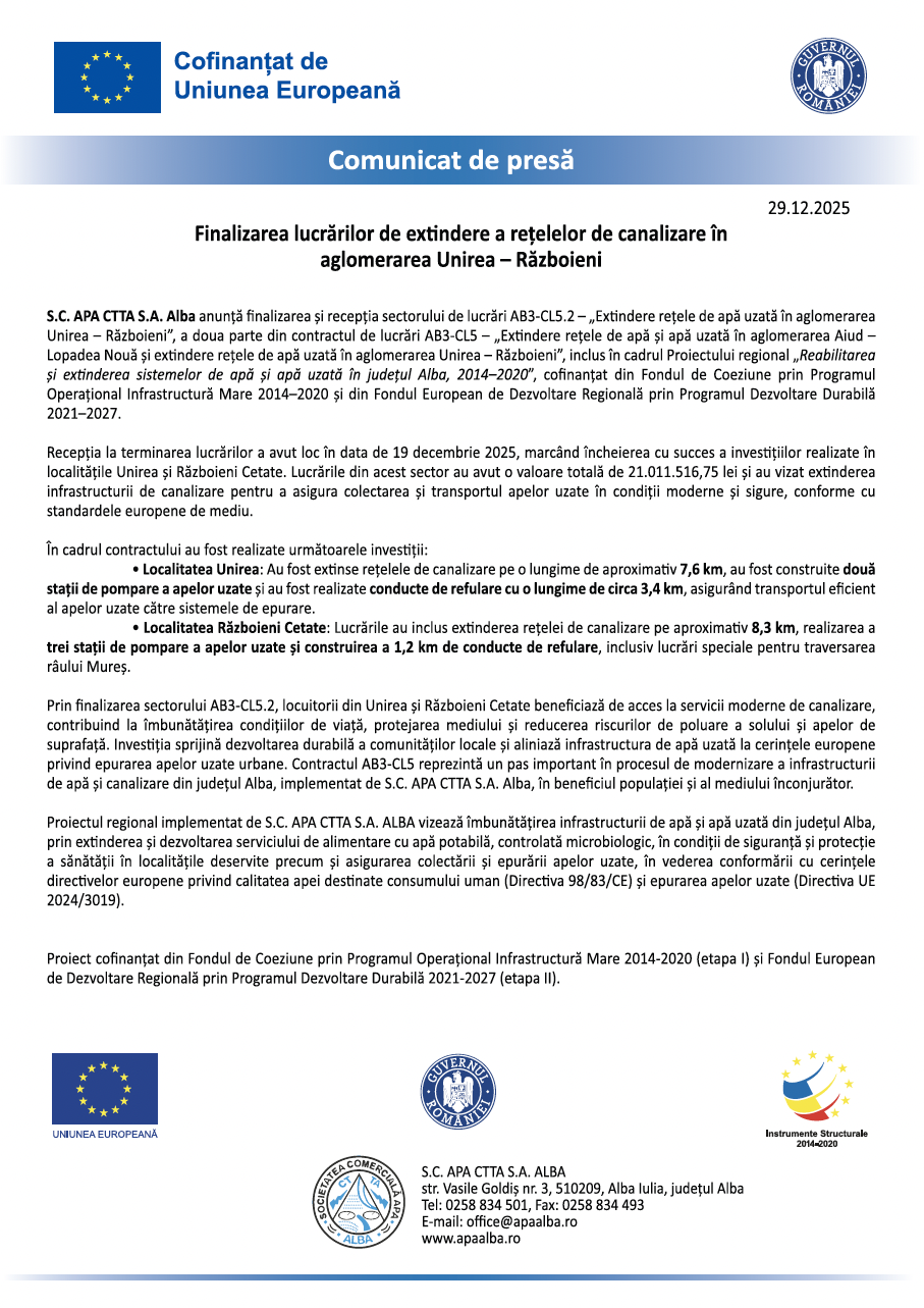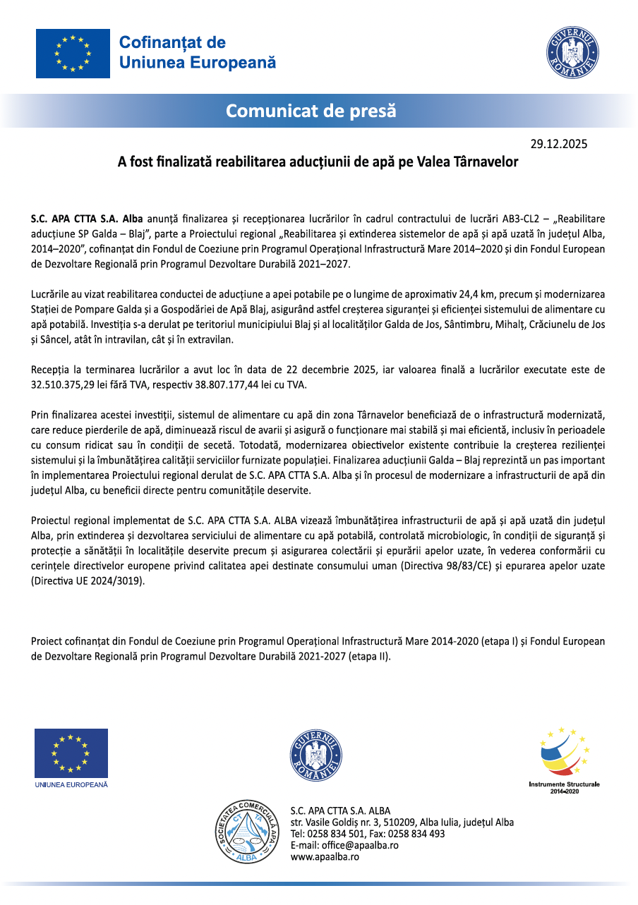 S.C. APA CTTA S.A. ALBA anunță finalizarea lucrărilor din cadrul contractului de lucrări de extindere a rețelelor de apă și apă uzată în aglomerarea Aiud – Lopadea Nouă